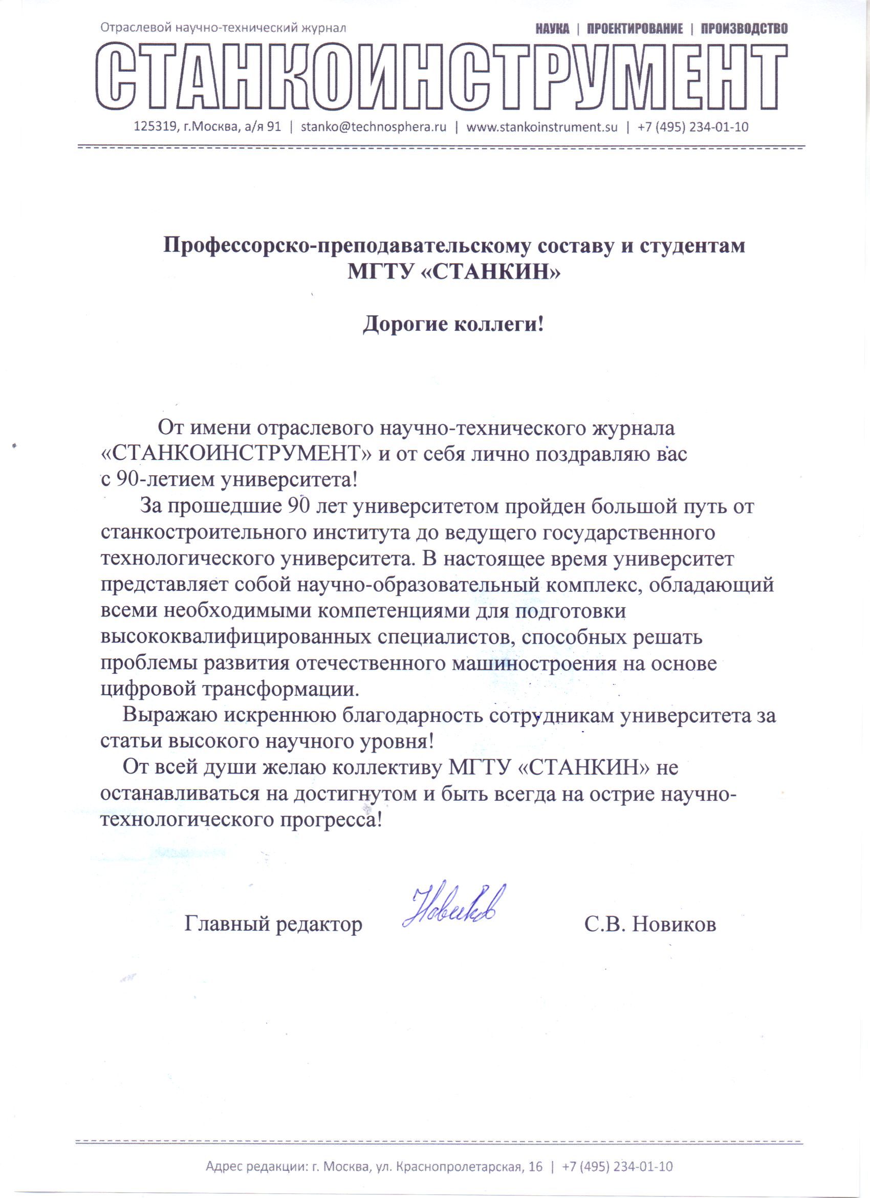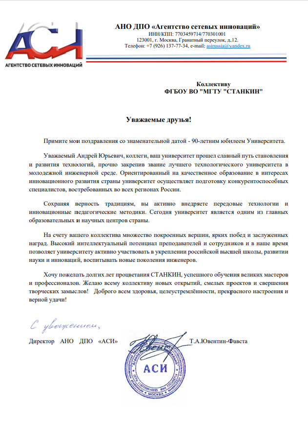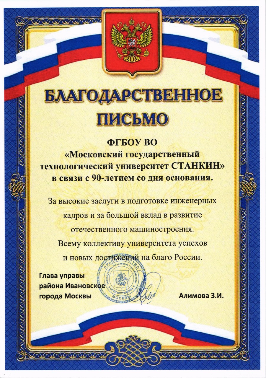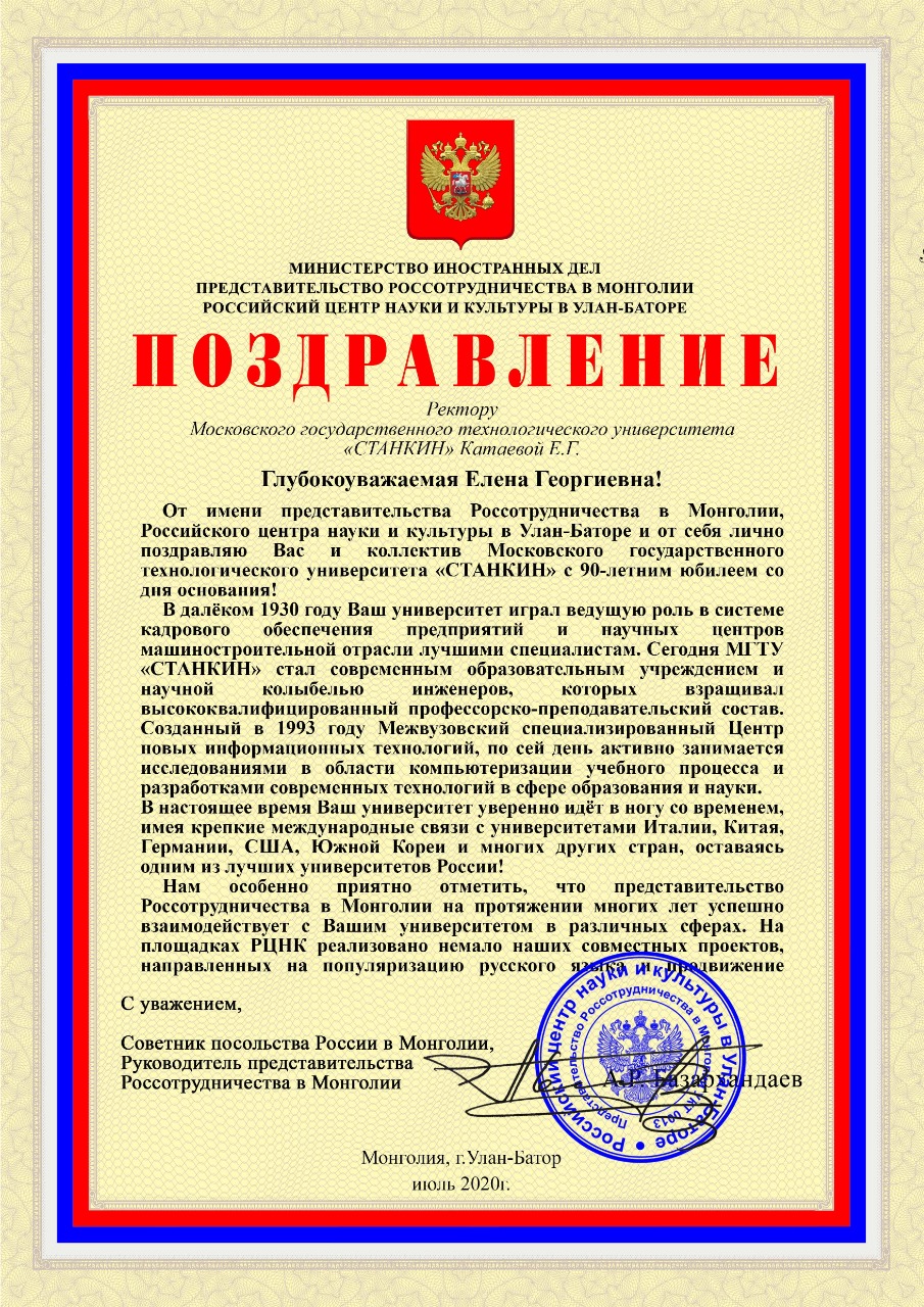 - Поздравление от Совета Ассоциации технических университетов, Ученого Совета и ректората Московского государственного технического университета имени Н.Э. Баумана