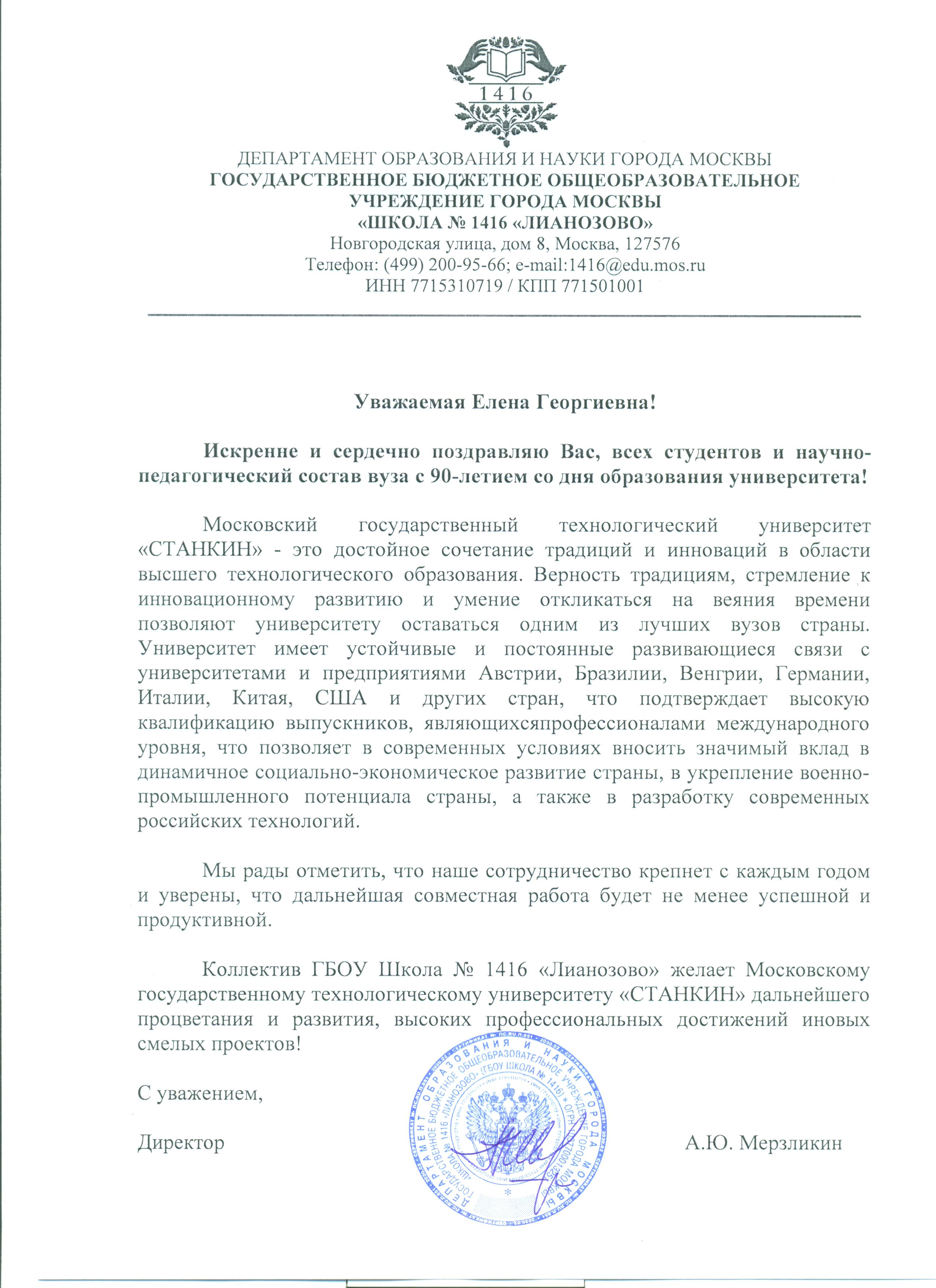 - Поздравление от ГБОУ Школа № 1416