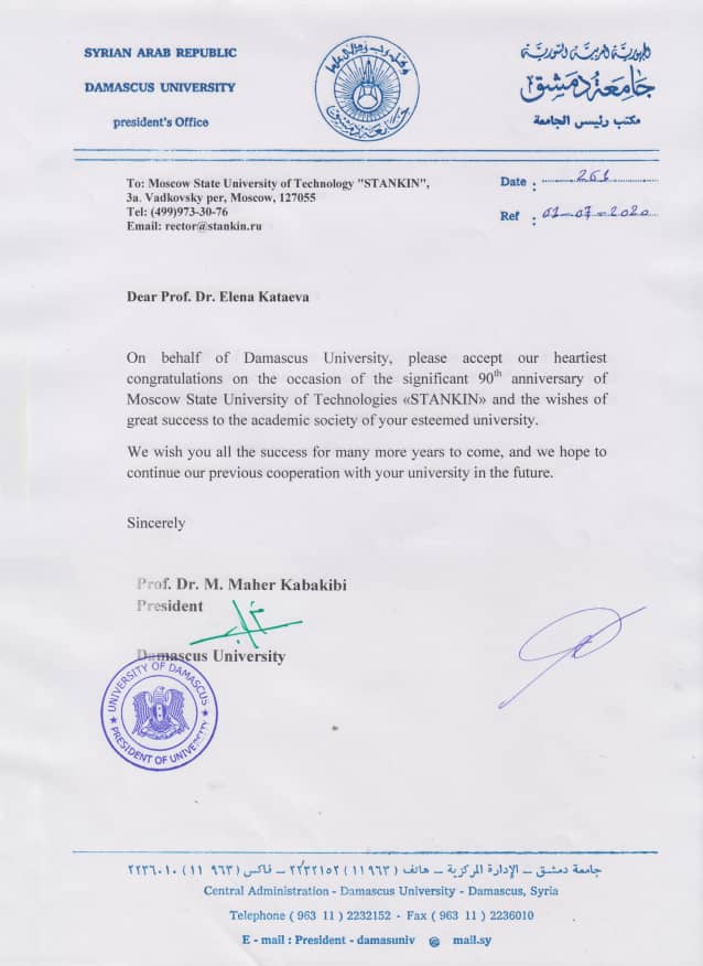 - Поздравление от Университета Дамаска (Сирийская Арабская Республика)