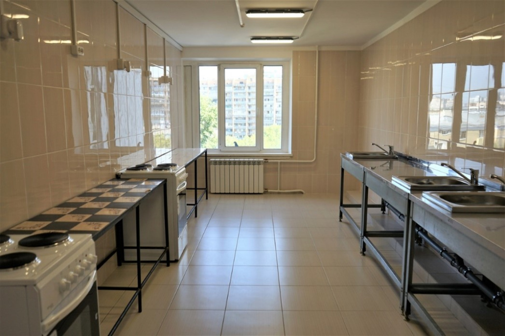 На каждом этаже расположены кухни общего пользования. В каждой кухне имеются 4 электрические плиты (по 4 конфорки каждая), 4 раковины, 6 разделочных столов. Горячая и холодная вода – постоянно. В бытовом комплексе общежития оборудованы помещения для стирки (установлены стиральные машины общего пользования) и глажки (гладильные столы, утюги). Стоимость одной стирки: бесплатная!