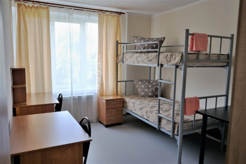 Система проживания в общежитии блочная. В каждом блоке 2 комнаты: 2-х местная (12 кв.м.) и 4-х местная (18 кв.м.), туалет, ванная (санузел раздельный). Студенты из одной страны размещаются отдельных блоках. В комнатах имеется вся необходимая для проживания мебель: шкафы, обеденный стол, кровати, тумбочки, столы для самостоятельной подготовки (индивидуально для каждого проживающего), стулья. Холодильник и телевизор – по желанию.