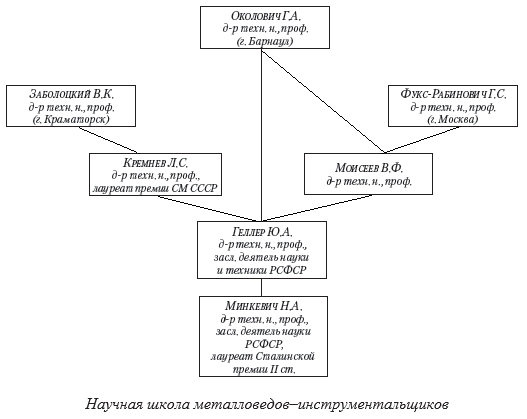 Благодаря целенаправленной работе школы впервые была создана теория легирования теплостойких инструментальных сталей (Л.С. Кремнев), на основе которой были разработаны стали различного назначения. Три из них включены в Государственный стандарт: Р12 (Л.С. Кремнев), Р12Ф3 (Ю.А. Геллер), Р12Ф4К5 (В.Ф. Моисеев). Более 20 марок теплостойких сталей широко поставляются в промышленность по техническим условиям металлургическими заводами. Применение сталей Р8М3К6Ф, 10Р8М3, В11М7К23, 2Х6В8М2К8, 11М5Ф, обладающих уникальными свойствами, позволило решить проблемы производства изделий специального назначения. Большой вклад в разработку и внедрение в промышленность инструментальных теплостойких сталей внесли: доктора технических наук, профессора Ю.А. Геллер, Л.С. Кремнев, В.Ф. Моисеев; кандидаты технических наук, профессора Ю.Е. Седов, А.М. Адаскин; кандидат технических наук, доцент А.К. Онегина; кандидаты технических наук, старшие научные сотрудники В.А. Брострем, Т.Г. Сагадеева, Л.М. Колобекова, Б.Л. Александрович, Е.С. Голубева.