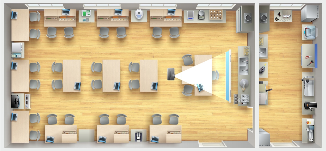 Ниже представлена схема кабинета и мастерской на базе стандартных архитектурно-строительных решений (в том числе для школ-новостроек по государственной программе «Школа – 2025»), приведены описания рабочих мест учащихся и преподавателя, представлены основные технические характеристики лабораторного, аналитического и специализированного оборудования, измерительных приборов, лабораторной мебели, средств ТСО и вспомогательного оборудования для мастерской.