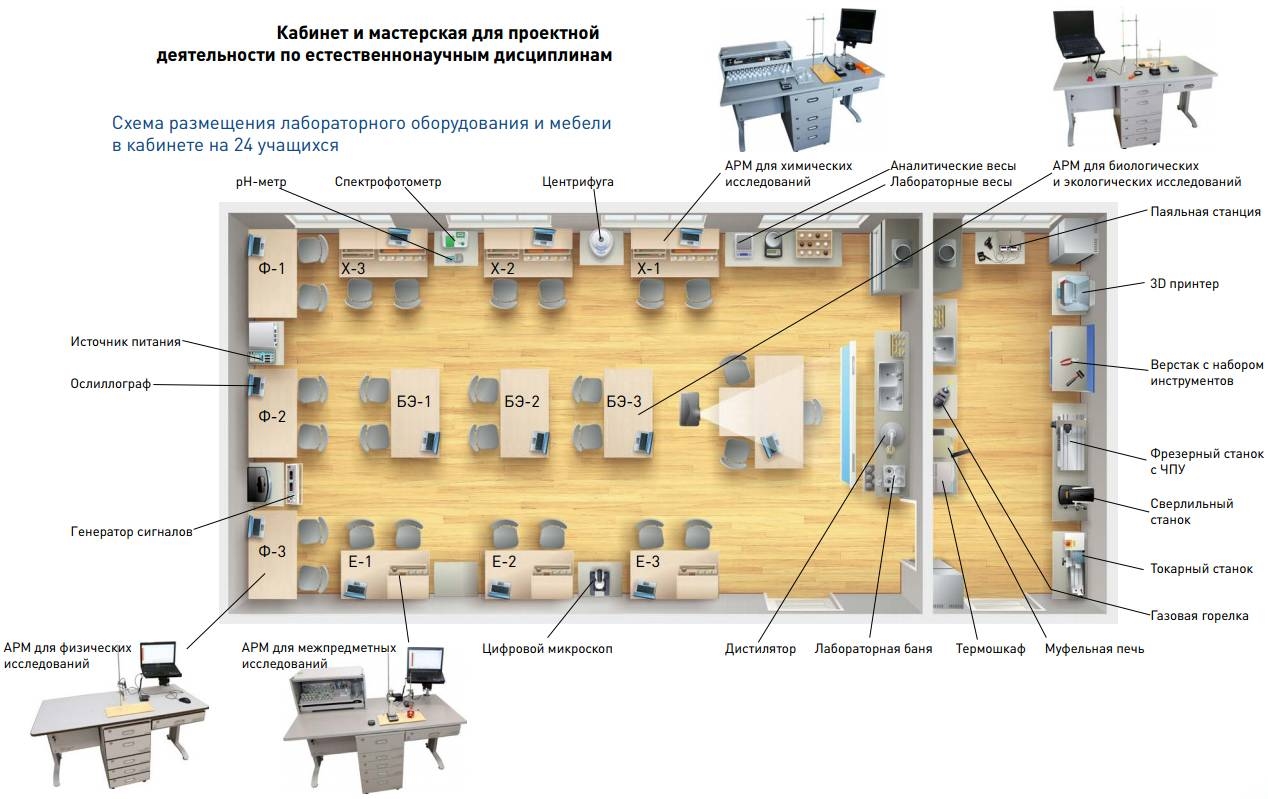 Кабинет и мастерская для учебно-исследовательской и проектной деятельности по естественнонаучным дисциплинам. Лабораторные комплексы для проведения учебной практической и проектной деятельности являются автоматизированными исследовательскими рабочими местами, в состав которых входят необходимые наборы лабораторного оборудования, приборов, приспособлений, инструментов.