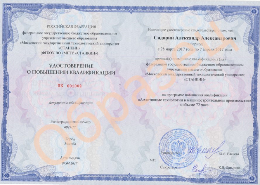По окончании обучения выдается удостоверение ФГАОУ ВО "МГТУ "СТАНКИН" о повышении квалификации установленного образца
